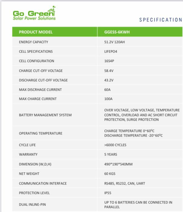 باتری لیتیومی 6 کیلووات گوگرین مدل GGESS-6KWH-51.2V-120AH (U-BTR) – Go Green