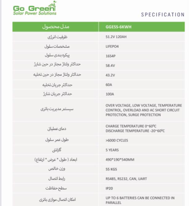 • ظرفیت: 6 کیلووات ساعت (51.2V / 120Ah)